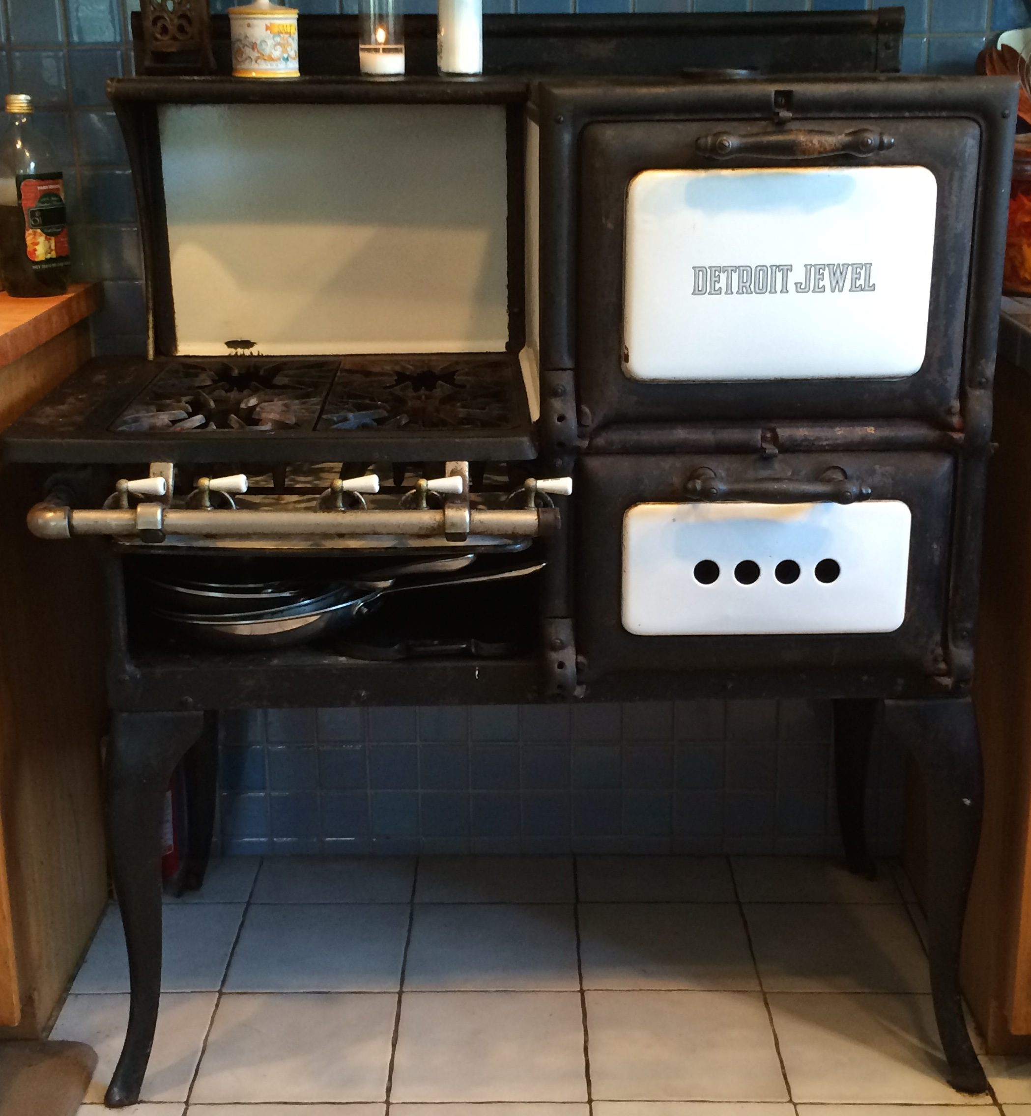 In August, we sold our 100 year-old Detroit Jewel gas cooking stove. My dad bought it at a swap meet in 1972 and not quite knowing what to do with it, gave it to me. When I got it, it was little more than a rusted out hulk and a box full of parts. I gave it a new coat of high heat black paint, cleaned the rust off the cast iron burners, polished the brass valves, bolted it together, and brought it back to life. I have used it as my kitchen stove ever since. I moved it to New Hampshire and back to LA in the mid 70’s, and for the past 30 years it has been a stalwart companion in our home in Venice. Thousands of wonderful meals have come from its 4 star-shaped burners and its temperamental oven. Jake learned how to cook on it as a very young boy, we used to cook together on it, Terry and Jake would bake together in its cranky little oven; there are many stories of his adventures with the Jewel. He posed in front of it for his 6th grade